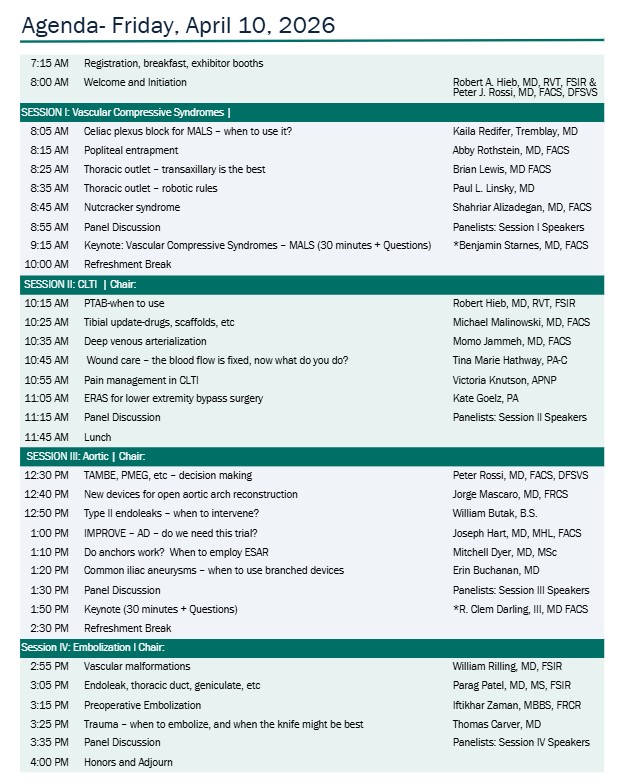 This educational symposium is designed to highlight a broad range of topics relating to vascular disease. It will familiarize the audience with natural history, surgical techniques, avoidance of complications, and new technology.